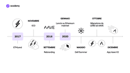 Nel 2018 compaiono i primi protocolli peer-to-contract, che eliminano questo problema facendo interagire debitori e prestatori con uno smart contract. È così che ETHLend passa da p2p a peer-to contract e diventa Aave. Il 2020, invece, è stato l’anno del lancio ufficiale sul mainnet di Ethereum. In ottobre si completa la migrazione dal token LEND al token AAVE. Nel Dicembre dello stesso anno viene lanciata la Versione 2 del protocollo Aave, con integrazioni avanzate che la rendono ancora più flessibile.